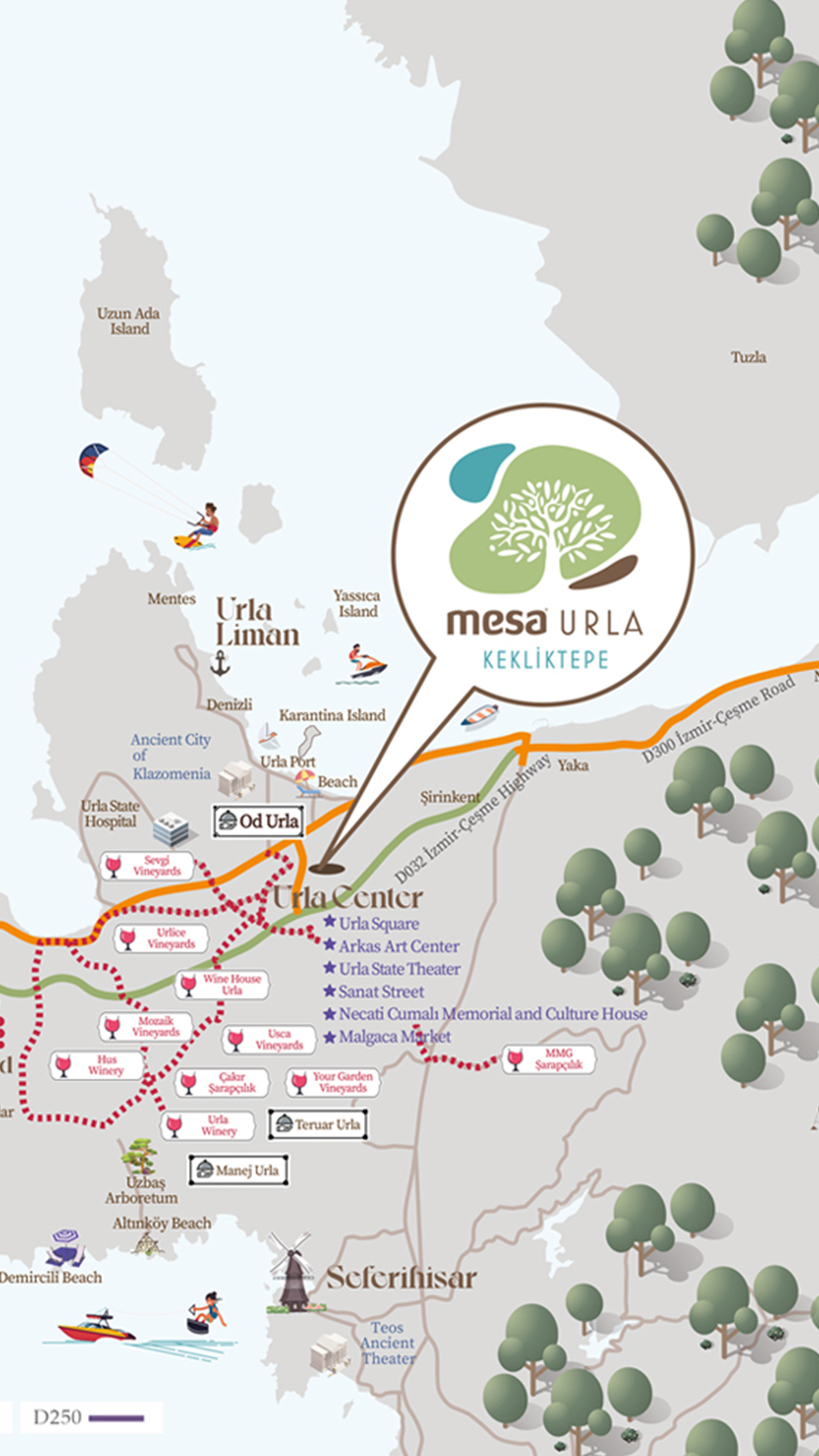 Mesa Urla Kekliktepe has a privileged location in Urla’s center where you can enjoy the Aegean vibes all year round. The city center, the airport and many other popular destinations will be within easy reach once you step out of your home.